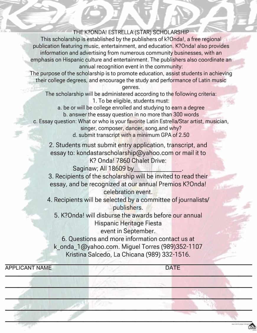 They the K?ONDA! Estrella (Star) Scholarship. The scholarship is established by publishers of K?ONDA! a free regional publication featuring music, entertainment, and I Feel like, and education. K?ONDA! also provides information and advertising from numerous community businesses, with an emphasis on Hispanic culture and entertainment. The publishers also coordinate an annual recognition event in the community.